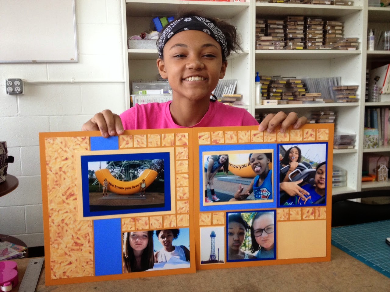 We used this cool Mac-n-Cheese patterned paper to create a fun mosaic. We still need to put the title "Cheesin' It Up at Kings Island" and add some journaling, but it is looking good! She is SUCH a smart kid with such creative ideas. It has been exciting and inspiring to work with her this year.